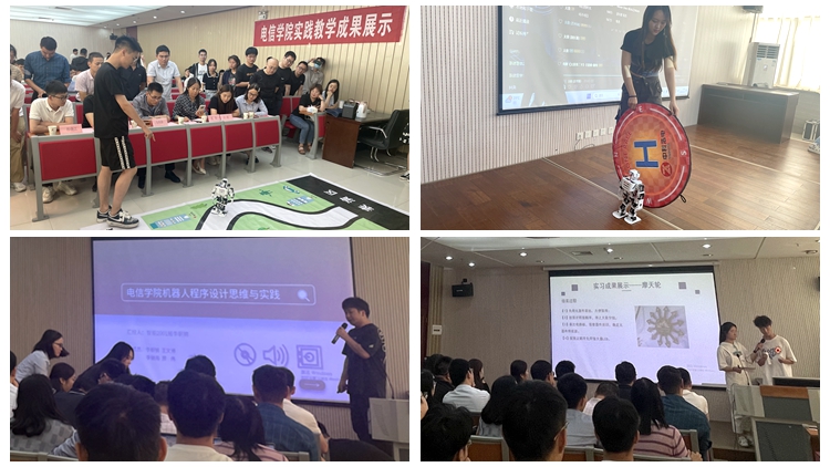 李亞文簡要介紹了電信學(xué)院本學(xué)期的實(shí)習(xí)實(shí)訓(xùn)開展情況。八個團(tuán)隊(duì)向與會人員展示了2022級《認(rèn)知實(shí)習(xí)》,2021級《綜合電子實(shí)訓(xùn)》,2020級《智能信息處理實(shí)訓(xùn)》《機(jī)器人程序設(shè)計(jì)思維與實(shí)踐》等相關(guān)課程實(shí)踐教學(xué)成果,通過代表性十足的創(chuàng)意作品以及惟妙惟肖的機(jī)器人展現(xiàn)出電信學(xué)院學(xué)子高超的動手能力和良好的專業(yè)素養(yǎng)。各位參會嘉賓在活動點(diǎn)評環(huán)節(jié)充分肯定了學(xué)院的實(shí)踐教學(xué)活動,并鼓勵廣大學(xué)子要在大學(xué)期間努力提高自身綜合素質(zhì),為今后的學(xué)習(xí)和工作打下堅(jiān)實(shí)基礎(chǔ)。