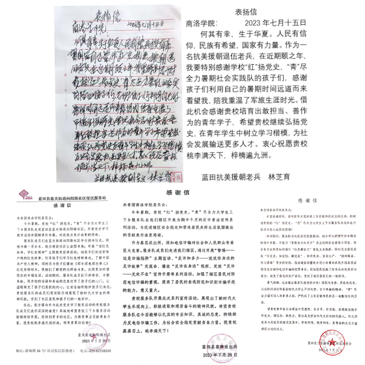 實踐活動扎實開展 社會團體高度認可。活動期間,實踐隊全體隊員工作準備充分、實踐狀態(tài)積極、內(nèi)容豐富充實。向參與活動的社區(qū)居民、學(xué)生普及黨史知識,對其提升政治能力起到了明顯的促進作用,受到當(dāng)?shù)孛癖姷囊恢潞迷u,收到了來自抗美援朝老兵林芝育手寫表揚信1封和來自藍關(guān)街道向陽路社區(qū)、葛牌派出所、三官廟移民社區(qū)感謝信3封,字里行間承載了受訪者和實踐單位對電信學(xué)院"紅"揚黨史,“青”盡全力社會實踐隊的感謝和認可。