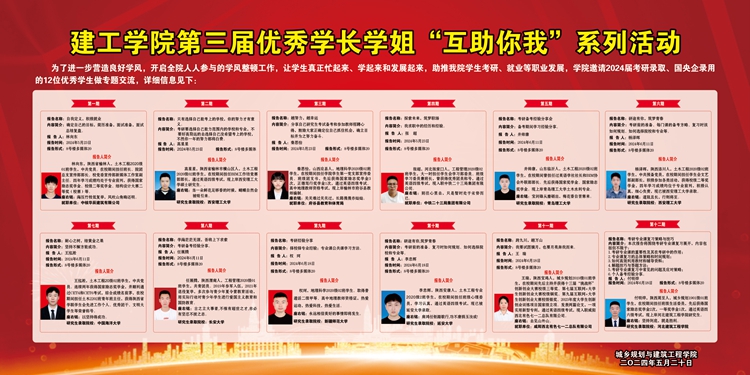 為充分發(fā)揮優(yōu)秀學(xué)生的榜樣示范引領(lǐng)作用,展現(xiàn)建工學(xué)院“黨建引領(lǐng)就業(yè)文化育人體系”黨建品牌建設(shè)的階段性成果,近日,建工學(xué)院開展第三屆優(yōu)秀學(xué)長學(xué)姐“互助你我”系列活動。來自2024屆地理科學(xué)、工程管理等12名優(yōu)秀學(xué)生代表分別圍繞研究生考試、國企面試、畢業(yè)簡歷設(shè)計、公務(wù)員及事業(yè)單位考試等方面做了經(jīng)驗交流,2021、2022、2023級學(xué)生參加本次活動。