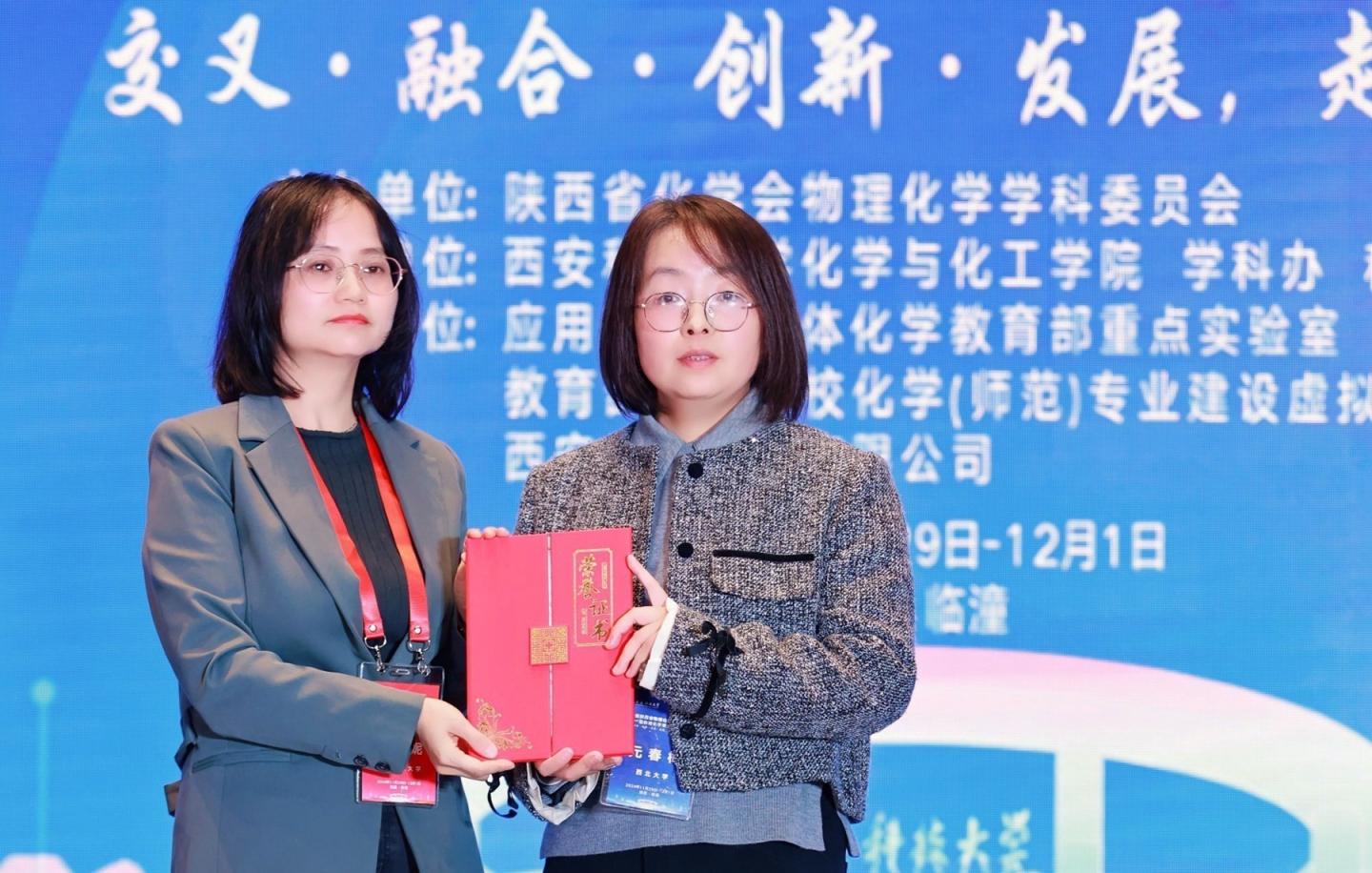 本次會(huì)議展出了來(lái)自省內(nèi)20余所科研院校提交的78份墻報(bào),其中16份墻報(bào)獲獎(jiǎng),元春梅等參與指導(dǎo)制作的墻報(bào)“基于席夫堿配體的稀土多核配合物的研究及應(yīng)用”獲得三等獎(jiǎng)。陜西師范大學(xué)光化學(xué)領(lǐng)域?qū)<荫R佳妮教授為元春梅頒發(fā)了大會(huì)邀請(qǐng)報(bào)告榮譽(yù)證書。