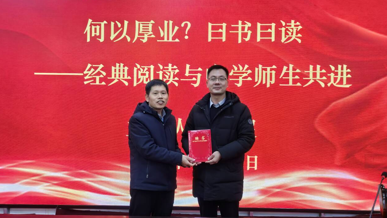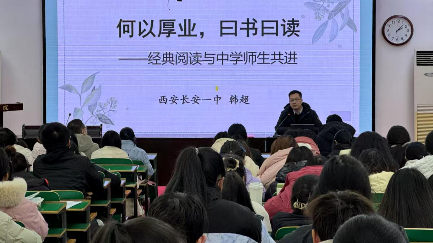 為進(jìn)一步提升師范生專業(yè)素養(yǎng),打造落地性更強(qiáng)的實(shí)踐學(xué)習(xí)平臺(tái),12月26日下午,人文學(xué)院邀請(qǐng)陜西省優(yōu)秀教師、中學(xué)語(yǔ)文高級(jí)教師、長(zhǎng)安一中副校長(zhǎng)韓超擔(dān)任主講嘉賓,為師生作實(shí)踐教學(xué)“經(jīng)典研讀”專題報(bào)告。人文學(xué)院院長(zhǎng)張文諾為韓超老師頒發(fā)漢語(yǔ)言文學(xué)專業(yè)授課專家聘書(shū),副院長(zhǎng)張建軍、學(xué)院教師代表和2023級(jí)漢語(yǔ)言文學(xué)專業(yè)全體學(xué)生參加報(bào)告會(huì)。