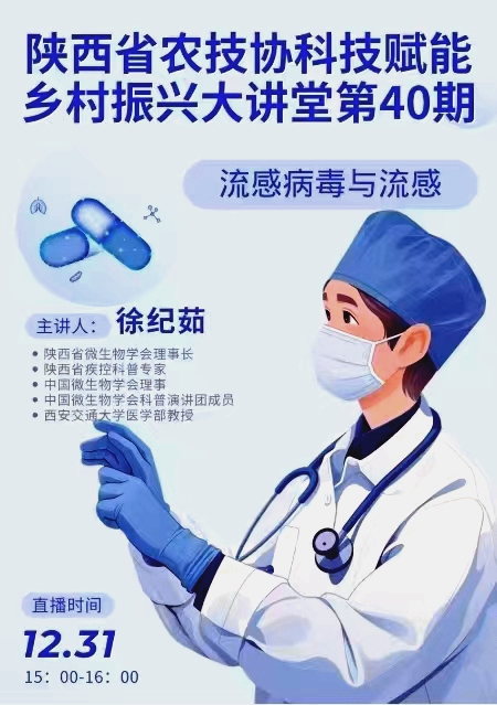 此次直播課是“陜西省農(nóng)技協(xié)科技賦能鄉(xiāng)村振興大講堂”的第40期,由陜西省科學(xué)技術(shù)協(xié)會(huì)主辦,陜西省微生物學(xué)會(huì)等3家單位承辦。直播課上,徐教授用通俗易懂的語(yǔ)言,生動(dòng)講解了流感病毒的病原生物學(xué)特點(diǎn)、類型、傳染性和抵抗力等健康知識(shí),以生活案例為切入點(diǎn)詳細(xì)闡釋了流感的臨床表現(xiàn)、病原、高發(fā)季節(jié)、傳播途徑、致病致死率、潛伏期、流行史等內(nèi)容,告訴大家發(fā)熱不適時(shí)如何自我判斷、如何正確用藥就醫(yī),引導(dǎo)大家通過及時(shí)接種疫苗、科學(xué)佩戴口罩、保障充足睡眠、遠(yuǎn)離密集場(chǎng)所、加強(qiáng)運(yùn)動(dòng)鍛煉等方式預(yù)防流感。