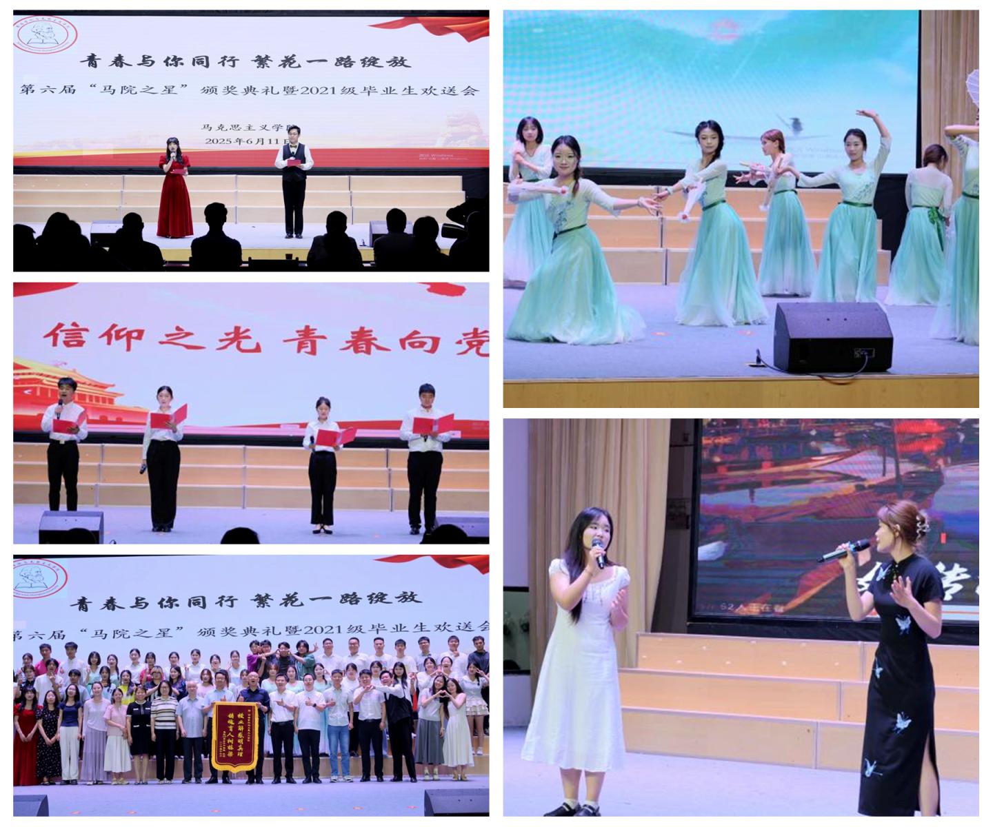 晚會(huì)環(huán)節(jié)精彩紛呈,高潮迭起。舞蹈《雨澗春行圖》、歌曲《青花瓷》、朗誦《青春向黨·信仰之光》、師生合唱《鳳凰花開的路口》等節(jié)目充分展現(xiàn)了馬院師生團(tuán)結(jié)奮進(jìn)、昂揚(yáng)向上的精神風(fēng)貌,為畢業(yè)生們留下了難忘的校園回憶。