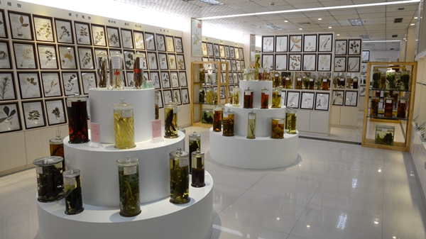 標(biāo)本陳列室保存有自1979年以來收藏的植物蠟葉標(biāo)本近9000份,植物浸制標(biāo)本130份,土壤剖面標(biāo)本18份,五大水系水樣15份,中藥材飲片標(biāo)本480份。其中不僅有野生葛根、巨型野靈芝、杜仲等名貴藥用植物,也包含了享譽中外的多種地道商洛藥材——丹參、桔梗、連翹、黃芩、五味子、金銀花、山茱萸、黃姜等。